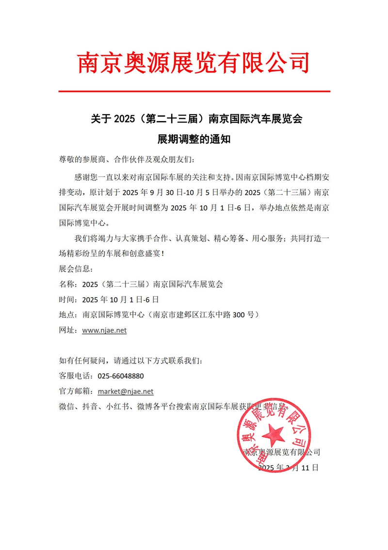 关于2025(第二十三届)南京国际汽车展览会展期调整的通知